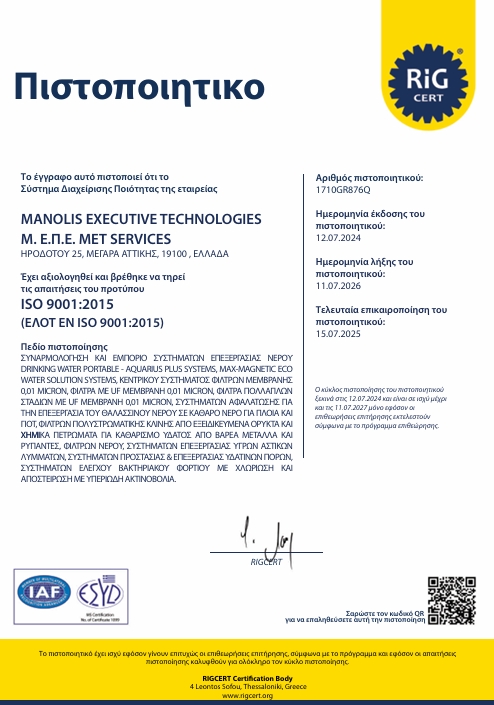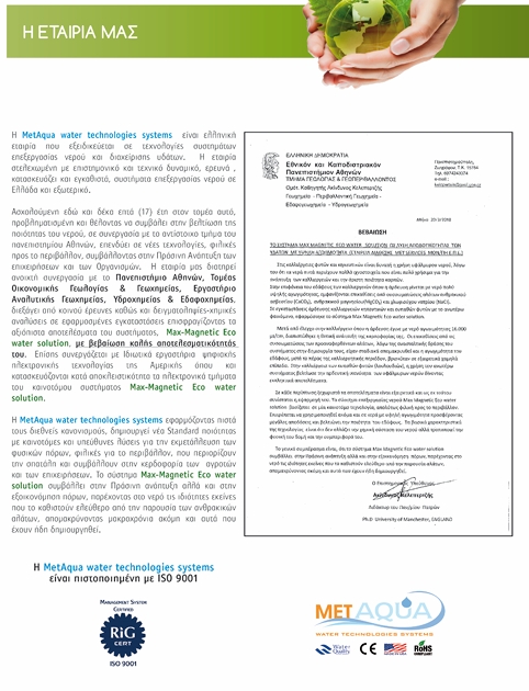 Η MetAqua water technologies systems είναι ελληνική εταιρία που εξειδικεύεται σε τεχνολογίες συστημάτων επεξεργασίας νερού και διαχείρισης υδάτων. Η εταιρία στελεχωμένη με επιστημονικό και τεχνικό δυναμικό, ερευνά , κατασκευάζει και εγκαθιστά, συστήματα επεξεργασίας νερού σε Ελλάδα και εξωτερικό. Ασχολούμενη εδώ και δέκα επτά (17) έτη στον τομέα αυτό, προβληματισμένη και θέλοντας να συμβάλει στην βελτίωση της ποιότητας του νερού, σε συνεργασία με το αντίστοιχο τμήμα του Πανεπιστημίου Αθηνών, επενδύει σε νέες τεχνολογίες, φιλικές προς το περιβάλλον, συμβάλλοντας στην Πράσινη Ανάπτυξη. Η εταιρία μας διατηρεί ανοιχτή συνεργασία με το Πανεπιστήμιο Αθηνών- Τμήμα Γεωλογίας και Γεωπεριβάλλοντος, διεξάγει από κοινού έρευνες καθώς και δειγματοληψίες-χημικές αναλύσεις σε εφαρμοσμένες εγκαταστάσεις επισφραγίζοντας τα αξιόπιστα αποτελέσματα του συστήματος, Max-Magnetic Eco water solution , με βεβαίωση καλής αποτελεσματικότητάς του. Επίσης συνεργάζεται με Ιδιωτικά εργαστήρια ψηφιακής ηλεκτρονικής τεχνολογίας της Αμερικής όπου και κατασκευάζονται κατά αποκλειστικότητα τα ηλεκτρονικά τμήματα του καινοτόμου συστήματος Max-Magnetic Eco water solution. Η εταιρία είναι πιστοποιημένη με ISO 9001:2015 & ISO 14001: 2015