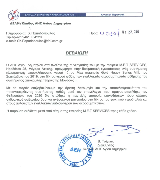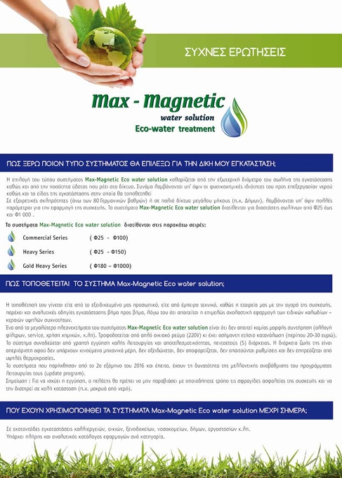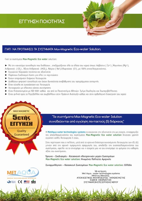 ΓΙΑΤΙ ΝΑ ΠΡΟΤΙΜΗΣΩ ΤΑ ΣΥΣΤΗΜΑΤΑ Max magnetic eco water solution; Γιατί τα συστήματα Max magnetic eco water solution: ➢ Με την καινοτόμα τεχνολογία που διαθέτουν , επεξεργάζονται όλα τα άλατα του νερού όπως: Ασβέστιο Ca+, Μαγνήσιο Mg , Χλωριούχα Cl- , Νάτριο Na με μεγάλη αποτελεσματικότητα ➢ Εγγυόνται Κορυφαία ποιότητα και αξιοπιστία ➢ Παρέχουν Σχεδιασμό Λύσης για όλες τις περιπτώσεις ➢ Δίνουν 5 Χρόνια Εγγύηση καλής λειτουργίας ➢ Είναι εύκολα σε εγκατάσταση και λειτουργία ➢ Λειτουργούν με ελάχιστο κόστος συντήρησης ➢ Είναι Πιστοποιημένα με ISO 9001 καθώς και από το Πανεπιστήμιο Αθηνών- Τμήμα Γεωλογίας και Γεωπεριβάλλοντος ➢ Είναι φιλικά προς το Περιβάλλον και συμβάλλουν στην Πράσινη Ανάπτυξη καθώς και στην ορθολογική διαχείριση του νερού Η MetAqua water technologies systems ενισχύοντας την αξιοπιστία της ως εταιρία, επισφραγίζει την αποτελεσματικότητα του συστήματος Max-Magnetic Eco water solution δίνοντας γραπτή εγγύηση καλής λειτουργίας 5 ετών. Στην περίπτωση που ο πελάτης, μετά από το χρονικό διάστημα συνεχόμενης λειτουργίας των έξι (6) μηνών από την αρχική ημερομηνία εφαρμογής του, αποδείξει την αναποτελεσματικότητα του συστήματος, οφείλει να το επιστρέψει και η εταιρεία μας να του επιστρέψει τα χρήματα της καθαρής αξίας του συστήματος.