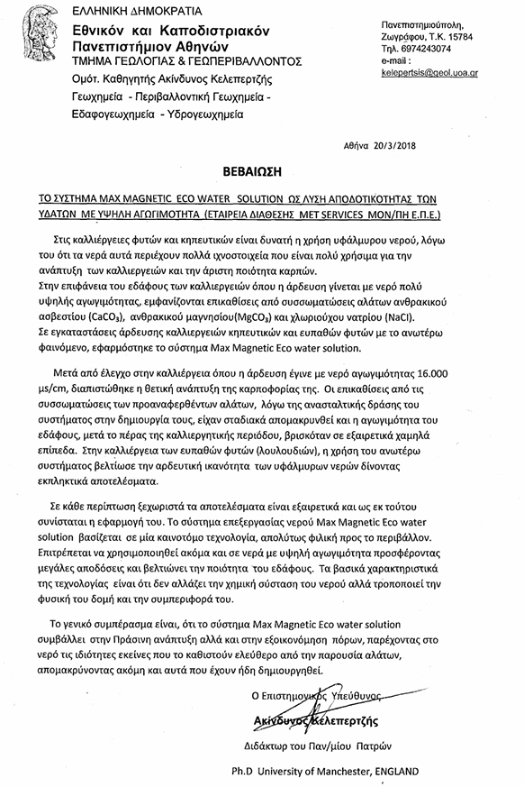 ΕΓΚΑΤΑΣΤΑΣΗ ΣΥΣΚΕΥΩΝ ΕΠΕΞΕΡΓΑΣΙΑΣ ΙΟΝΤΩΝ ΑΛΑΤΩΝ ΥΔΑΤΟΣ Max Magnetic Eco – water solution ΓΙΑ ΤΗΝ ΧΡΗΣΗ ΝΕΡΟΥ ΑΡΔΕΥΣΗΣ ΣΕ ΚΑΛΛΙΕΡΓΕΙΕΣ