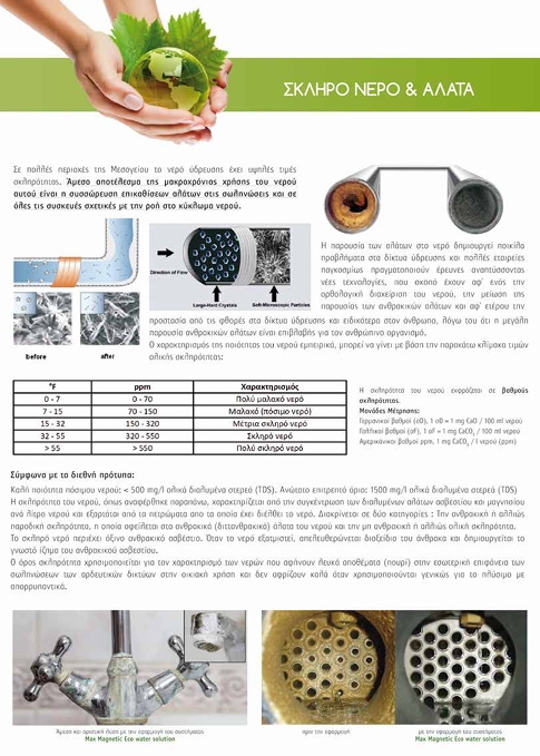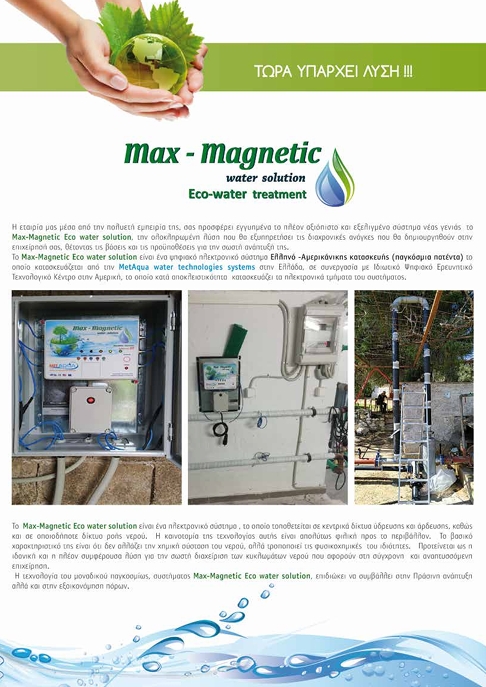 Στην Ελλάδα πολλές περιοχές έχουν πρόβλημα με την καθαρότητα του νερού και στην οικιακή χρήση τα σκληρά νερά όταν χρησιμοποιούνται γενικά για το πλύσιμο με απορρυπαντικά, δεν αφρίζουν καλά. Η καθημερινή ανθρώπινη δραστηριότητα, µέσω των επιμολύνσεων, καταστρέφει τα ήδη υπάρχοντα αποθέματα νερού. ΣΥΣΤΗΜΑ ΕΠΕΞΕΡΓΑΣΙΑΣ ΙΟΝΤΩΝ ΑΛΑΤΩΝ ΝΕΡΟΥ MAX MAGNETIC ECO WATER SOLUTION Η MetAqua water technologies systems έχει τις κατάλληλες και πιστοποιημένες λύσεις της φίλτρανσης του νερού ύδρευσης. Το σύστημα Max Magnetic Eco water solution έρχεται να δώσει την οριστική λύση στο πρόβλημα που δημιουργούν οι επικαθήσεις αλάτων και σας επιτρέπει να χρησιμοποιήσετε ακόμα και υφάλμυρα – αλατούχα νερά για την ύδρευση, τόσο για την επιχείρηση όσο και για την οικία σας. Το Max Magnetic Eco water solution είναι ένα ηλεκτρονικό σύστημα , το οποίο τοποθετείται σε κεντρικά δίκτυα ύδρευσης και άρδευσης, καθώς και σε οποιοδήποτε δίκτυο ροής νερού. Η τεχνολογία του μοναδικού παγκοσμίως, αμερικανικού συστήματος Max Magnetic Eco water solution, επιδιώκει να συμβάλλει στην Πράσινη ανάπτυξη αλλά και στην εξοικονόμηση πόρων, μειώνοντας κάθε κίνδυνο. Το σύστημα Max Magnetic Eco water solution επεξεργάζεται τα ιόντα των αλάτων του νερού ύδρευσης και συγκεκριμένα τις ενώσεις και τις συσσωματώσεις των αλάτων Ασβεστίου, Μαγνησίου, Καλίου, Νατρίου, Χλωρίου, κ.λπ. Αυτό πραγματοποιείται με την δημιουργία ισχυρού ηλεκτρομαγνητικού πεδίου από ηλεκτρομαγνητικά κύματα των οποίων οι ειδικές Fuzzy Logic συχνότητες είναι διαρκώς εναλλασσόμενες & μεταβαλλόμενες .Τα ηλεκτρομαγνητικά αυτά κύματα ΄βομβαρδίζουν΄ και διασπούν τις ενώσεις των ανθρακικών ιόντων και των ιόντων του ασβεστίου, δηλαδή κατά κύριο λόγο το ανθρακικό ασβέστιο, το οποίο είναι υπεύθυνο για την δημιουργία των επικαθίσεων αλάτων εντός του δικτύου, καθώς και τις ενώσεις Χλωριούχου Νατρίου (NaCl) που αυξάνουν την αγωγιμότητα στο έδαφος.
