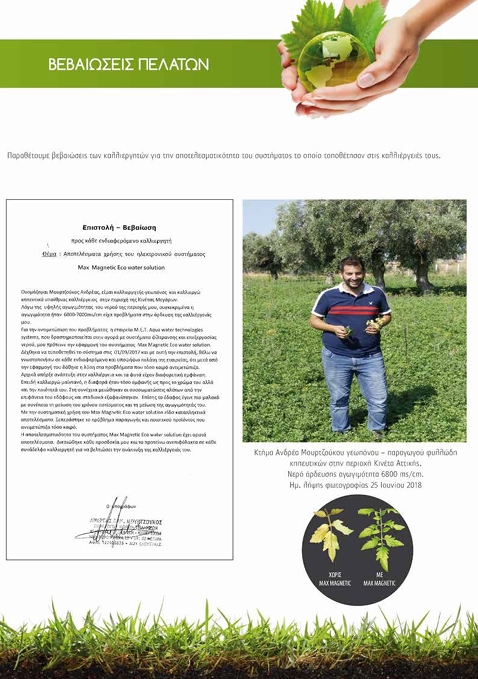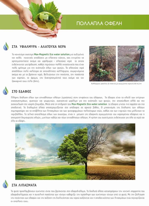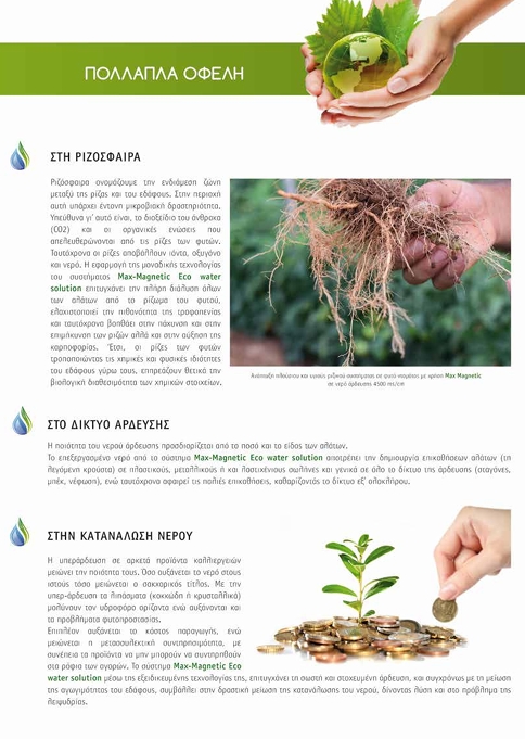 Η επεξεργασία νερού χωρίς μείωση ροής, χωρίς αναλώσιμα φίλτρα και συντήρηση Τα οφέλη που προκύπτουν από την χρήση του επεξεργασμένου νερού από το σύστημα Max magnetic eco water solution είναι πολλαπλά. Tο σύστημα σας επιτρέπει να χρησιμοποιήσετε υφάλμυρα και σκληρά νερά για πιο ποιοτικές αποδόσεις με ελάχιστο κόστος. Ταυτόχρονα βελτιώνει την ποιότητα των εδαφών σας αφαιρώντας όλες τις παλιές επικαθίσεις αλάτων και αυξάνει την αποδοτικότητα των λιπασμάτων. Γίνεται πλήρης διάλυση όλων των αλάτων του εδάφους και της κρούστας που σχηματίζουν, με αποτέλεσμα το έδαφος να γίνεται πιο αφράτο και πιο αποδοτικό. Τα διαλυμένα άλατα αποστραγγίζονται στο υπέδαφος σε αρκετό βάθος. Ο μηχανισμός της διάλυσης των αλάτων λειτουργεί και στα απόβλητα των λιπασμάτων και των φυτοφαρμάκων παλαιότερων ετών, όπως και τα νιτρικά που μολύνουν το περιβάλλον. Αυτό έχει ως αποτέλεσμα την μείωση της εδαφικής αγωγιμότητας των κορεσμένων εδαφών και την αποτροπή δημιουργίας αλγών και μυκήτων. H αφαίρεση των παλιών επικαθίσεων αλάτων στο έδαφος και η μείωση της αγωγιμότητας του εδάφους συμβάλλουν στην δραστική μείωση κατανάλωσης του νερού άρδευσης. Το σύστημα Max magnetic eco water solution βοηθά τις μεμβράνες του ριζώματος των φυτών να παραμένουν διαπερατές για την εύκολη ανάληψη όλων των στοιχείων που του παρέχουμε μέσω των λιπασμάτων, ελαχιστοποιώντας την πιθανότητα της τροφοπενίας, ενώ ταυτόχρονα συμβάλλει στην πάχυνση και στην επιμήκυνση των ριζών, με αποτέλεσμα την αύξηση της καρποφορίας.