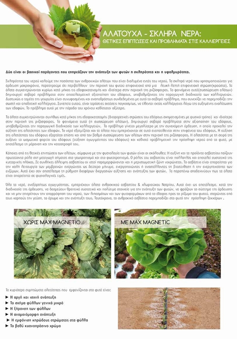 Η αυξανόμενη έλλειψη νερού καλής ποιότητας για την άρδευση των καλλιεργειών έχει ως αποτέλεσμα την όξυνση του προβλήματος. Συγκεκριμένα, η αυξανόμενη εναλάτωση του εδάφους σε βάρος των φυτών εξαρτάται από το βαθμό συσσώρευσης των αλάτων στη περιοχή της ριζόσφαιρας, γεγονός που συνδέεται άμεσα με το νερό άρδευσης. Η υψηλή συγκέντρωση των αλάτων στη περιοχή αυτή (ρίζα του φυτού), αυξάνει σημαντικά το ωσμωτικό φορτίο του εδαφολύματος (αύξηση αγωγιμότητας εδάφους) και καθιστά προβληματική την πρόσληψη νερού από το φυτό, με συνέπεια την μάρανσή του και την τελική καταστροφή του. Το καινοτόμο σύστημα επεξεργασίας νερού Max magnetic eco water solution εγκαθίσταται για την καθολική προστασία του δικτύου από τις συσσωματώσεις και επικαθίσεις των αλάτων του ασβεστίου (CaCO3), μαγνησίου (MgCO3) και χλωριούχου νατρίου (NaCl). Το σύστημα, εκπέμποντας συνεχείς εναλλασσόμενες συχνότητες, δρα και αποφορτίζει τα ιόντα των αλάτων για να μην έχουν την δυνατότητα χημικής συνένωσης. Τα καθιστά ανενεργά και μη ικανά για την δημιουργία συσσωματώσεων και επικαθίσεων στα δίκτυα ύδρευσης και άρδευσης των μηχανολογικών εγκαταστάσεων. Μερικά συχνά συμπτώματα της αλατότητας που εμφανίζονται στα φυτά είναι τα ακόλουθα:
