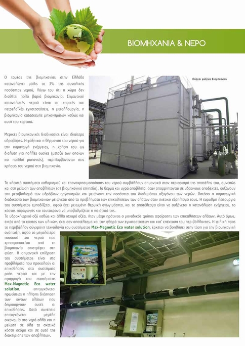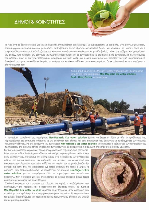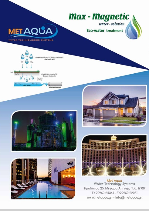 Η MetAqua water technologies systems εφαρμόζοντας πιστά τους διεθνείς κανονισμούς, δημιουργεί νέα Standard ποιότητας με καινοτόμες και υπεύθυνες λύσεις για την εκμετάλλευση των φυσικών πόρων, φιλικές για το περιβάλλον, που περιορίζουν την σπατάλη και συμβάλλουν στην κερδοφορία. Το ψηφιακό ηλεκτρονικό σύστημα Max-Magnetic Eco water solution συμβάλλει στην Πράσινη ανάπτυξη αλλά και στην εξοικονόμηση πόρων, παρέχοντας στο νερό τις ιδιότητες εκείνες που το καθιστούν ελεύθερο από την παρουσία των ανθρακικών αλάτων, απομακρύνοντας μακροχρόνια ακόμη και αυτά που έχουν ήδη δημιουργηθεί.