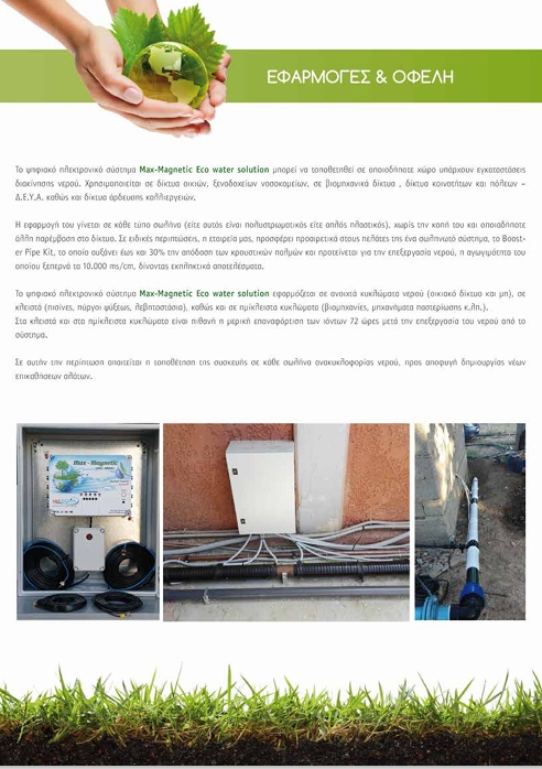 Μείωση της ποσότητας του απαιτούμενου νερού για άρδευση έως 50%, σημαντική αύξηση της απόδοσης των λιπασμάτων, αύξηση της απόδοσης των φυτοφαρμάκων, μηδενική φθορά του συστήματος άρδευσης από επικαθίσεις αλάτων και διάβρωση, αύξηση της ποσότητας της παραγωγής έως και 100%. Το σύστημα Max magnetic eco water solution μπορεί να χρησιμοποιηθεί σε : Καλλιέργειες, θερμοκήπια, υδροπονία κλπ. Μηχανολογικές εγκαταστάσεις (βιομηχανιών, ξενοδοχείων, δήμων κ.λπ.) Οποιοδήποτε δίκτυο νερού Η χρήση του συστήματος ενδείκνυται για όλα τα είδη νερού και όλα τα εδάφη. Δυνατότητα χρήσης σκληρού & υφάλμυρου νερού άρδευσης με υψηλή αγωγιμότητα. Η χρήση των νερών αυτών ενδείκνυται για άρδευση, λόγω του ότι περιέχουν πολλά ιχνοστοιχεία που είναι πολύ χρήσιμα για την ανάπτυξη όλων των φυτών. Δυνατή η βιολογική καλλιέργεια, εξαιτίας της δραστικής ενέργειας του νερού.