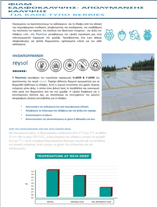Πριν το τέλος της καλλιέργειας φράουλας, η πρώτη εργασία για την επόμενη σαιζόν είναι να επιλέξει ο παραγωγός το φιλμ απολύμανσης εδάφους. Η εταιρεία ΑΧΑΪΚΑ ΠΛΑΣΤΙΚΑ ΑΕΒΕ σε συνεργασία με την Ισπανική βιομηχανία πλαστικών REYENVAS SA σας προτείνουν το REYSOL AD. Το reysol είναι φιλμ τεχνολογίας 7-layers θερμικό με αντισταγονική ιδιότητα Clear και με υψηλή σταθεροποίηση 150 ημέρες, πάχος 30 μικρά.