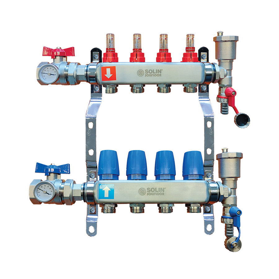 Σετ κολεκτέρ για ενδοδαπέδια θέρμανση με παροχόμετρα, δυνατότητα τοποθέτησης ηλεκτροθερμικών κεφαλών, βάνα με θερμόμετρο και στηρίγματα για πίνακες.